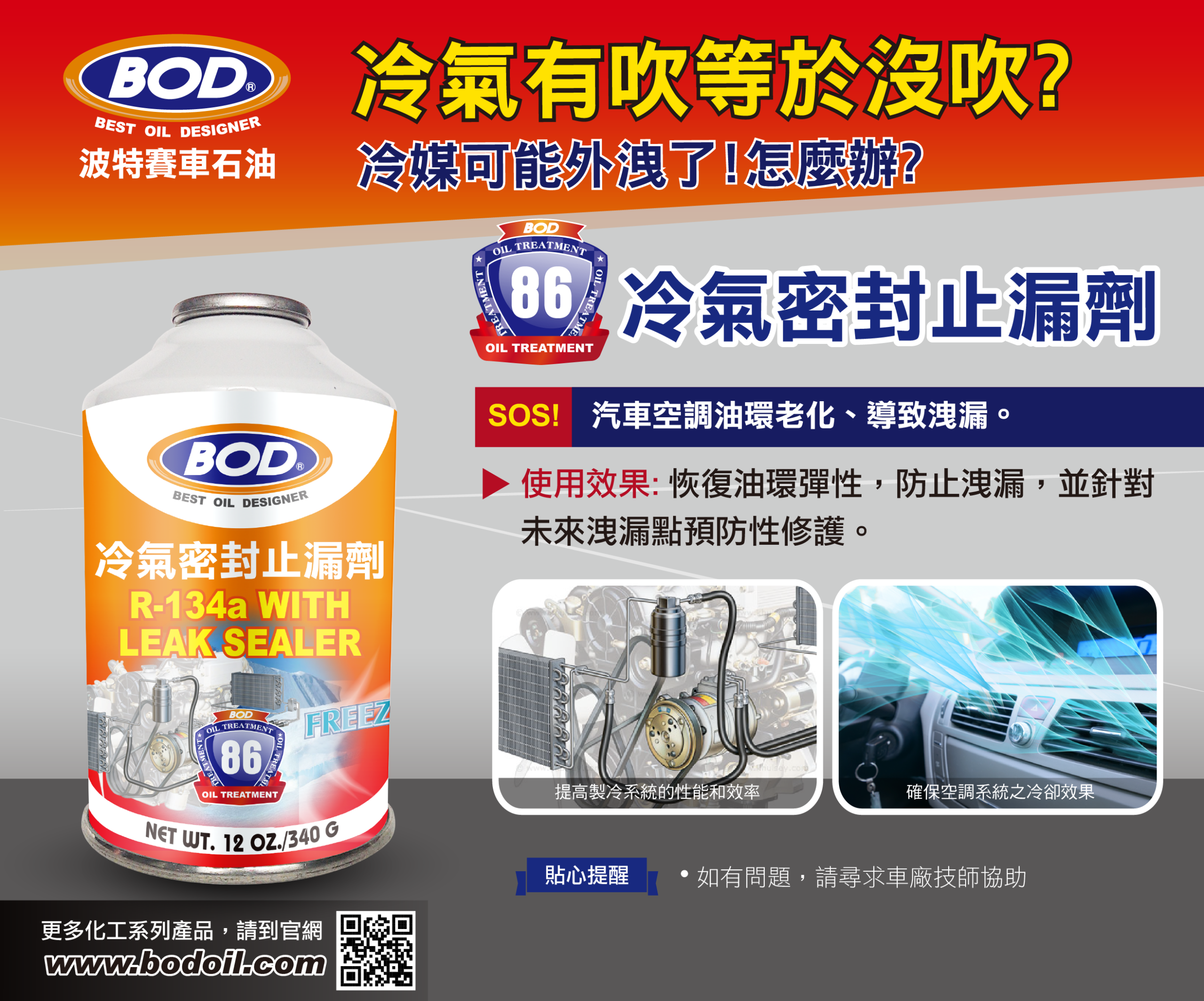 BOD 冷氣密封止漏劑 專為 R-134a 系統研發。它能隨著冷媒在系統中循環,遇到滲漏點時,會活化並潤潤橡膠組件使其膨脹,達到物理性的密封效果。340g 大容量包裝,不僅包含止漏成分,更含有補足系統所需的冷媒與潤滑油,保養一次到位。