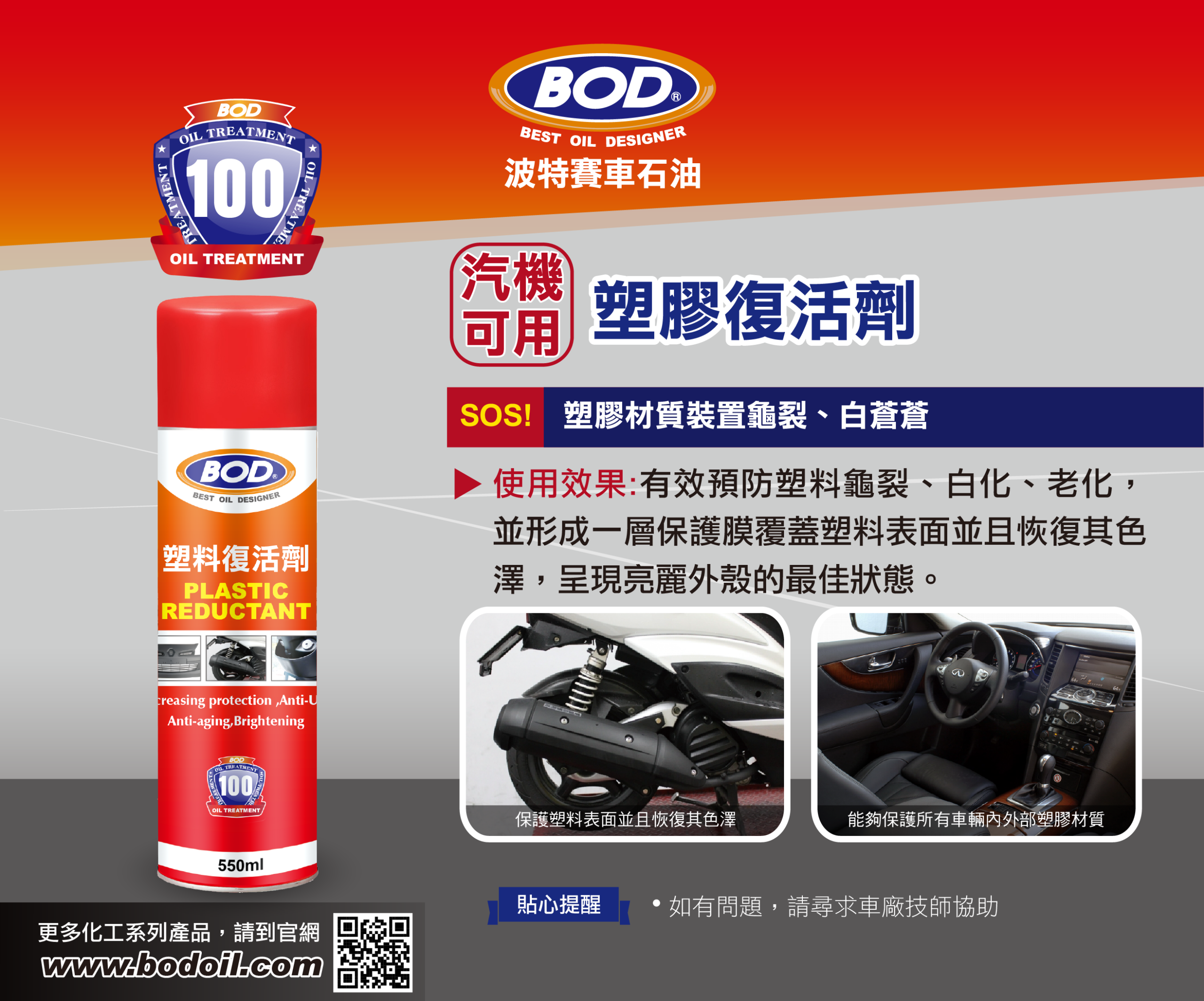 BOD 專業級塑料復活劑 專為解決汽車內外裝塑料老化而生。