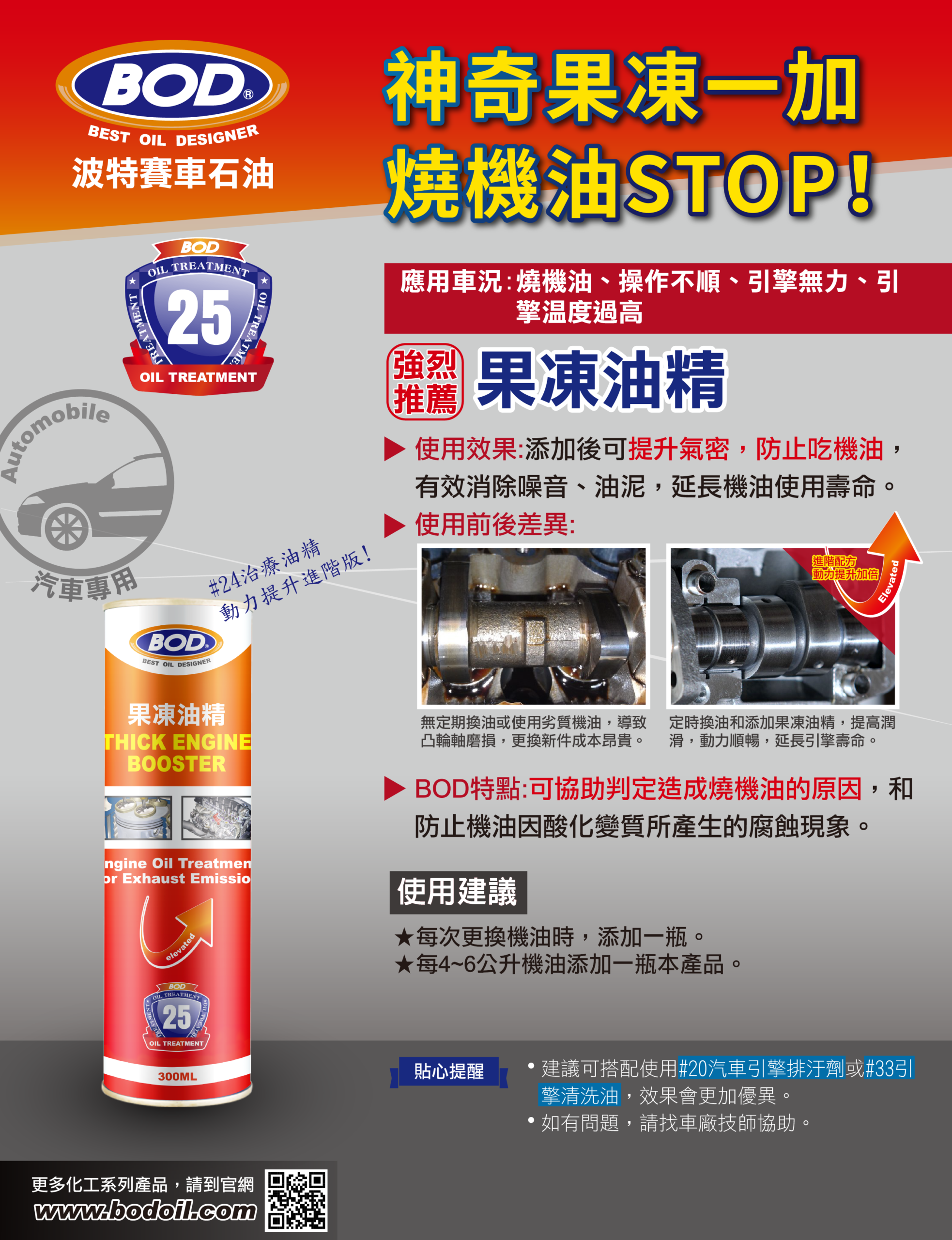 BOD 果凍油精 是一款高濃縮、高黏度的機油強化增稠劑。