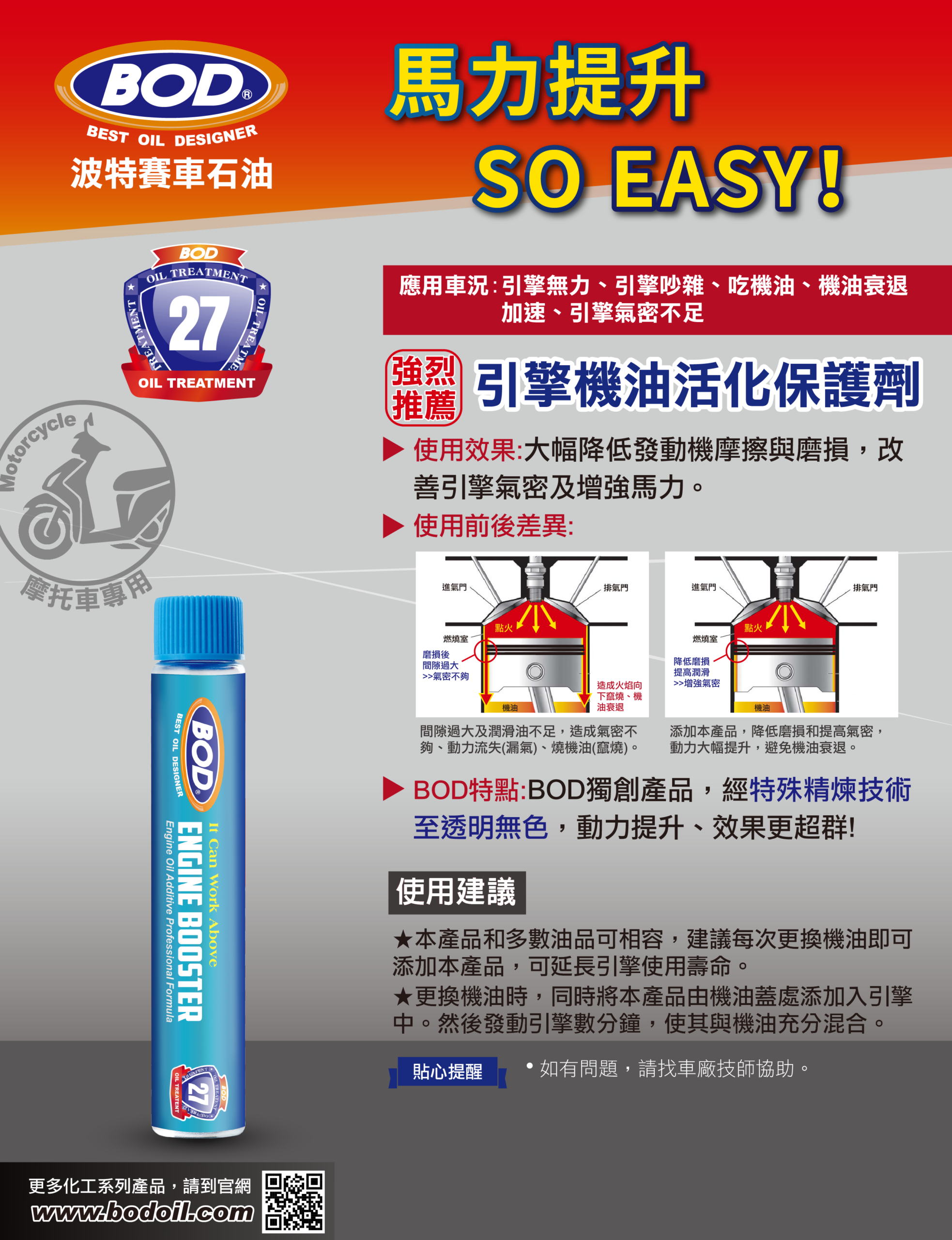 【BOD 波特】機車強效引擎保護劑 (50ml) 🛵 小排量大能量:專為高轉速機車打造的「液態金屬防護層」 機…