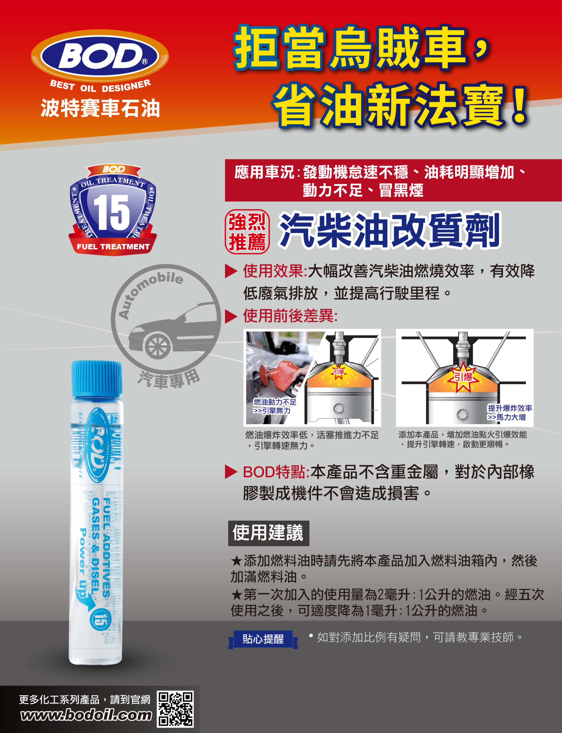 BOD 汽柴油改質劑 針對小油箱車款設計,50ml 剛剛好的份量,讓您在每次加油時都能輕鬆為愛車注入能量。
