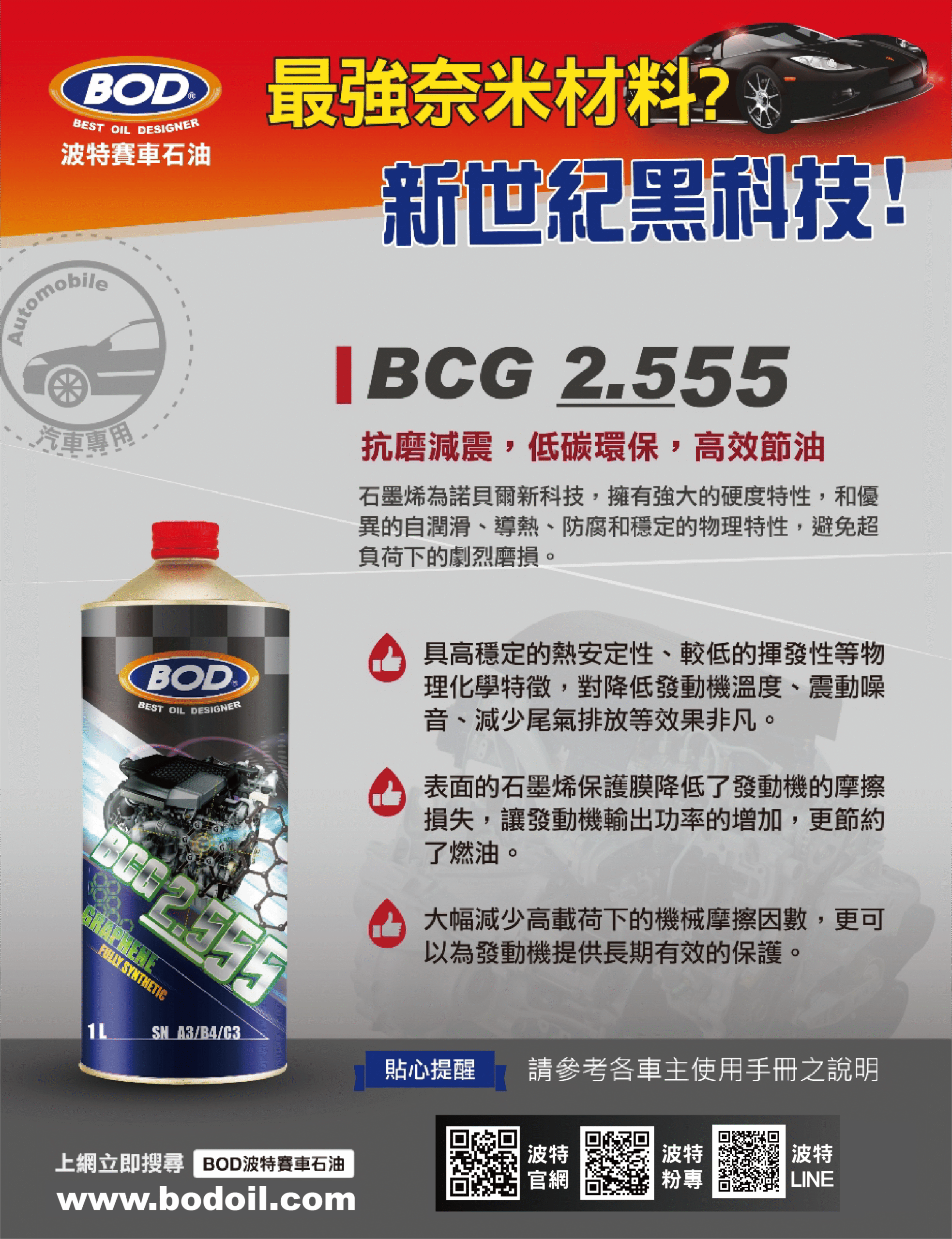 🚀 BOD BCG 2.555 新世紀黑科技 — 石墨烯全合成機油 🚀