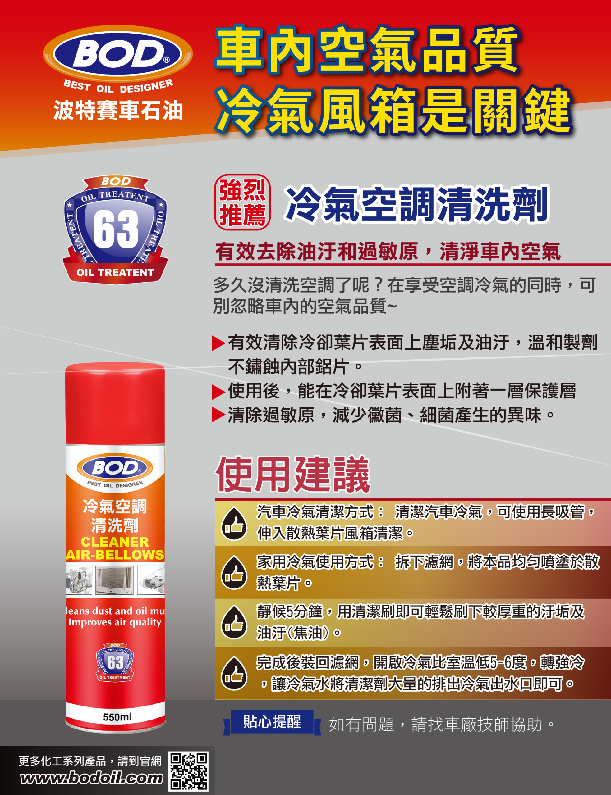 BOD 冷氣空調清洗劑 採用高活性除垢泡沫技術,能深入空調系統縫隙,將汙垢乳化並隨冷凝水排出。