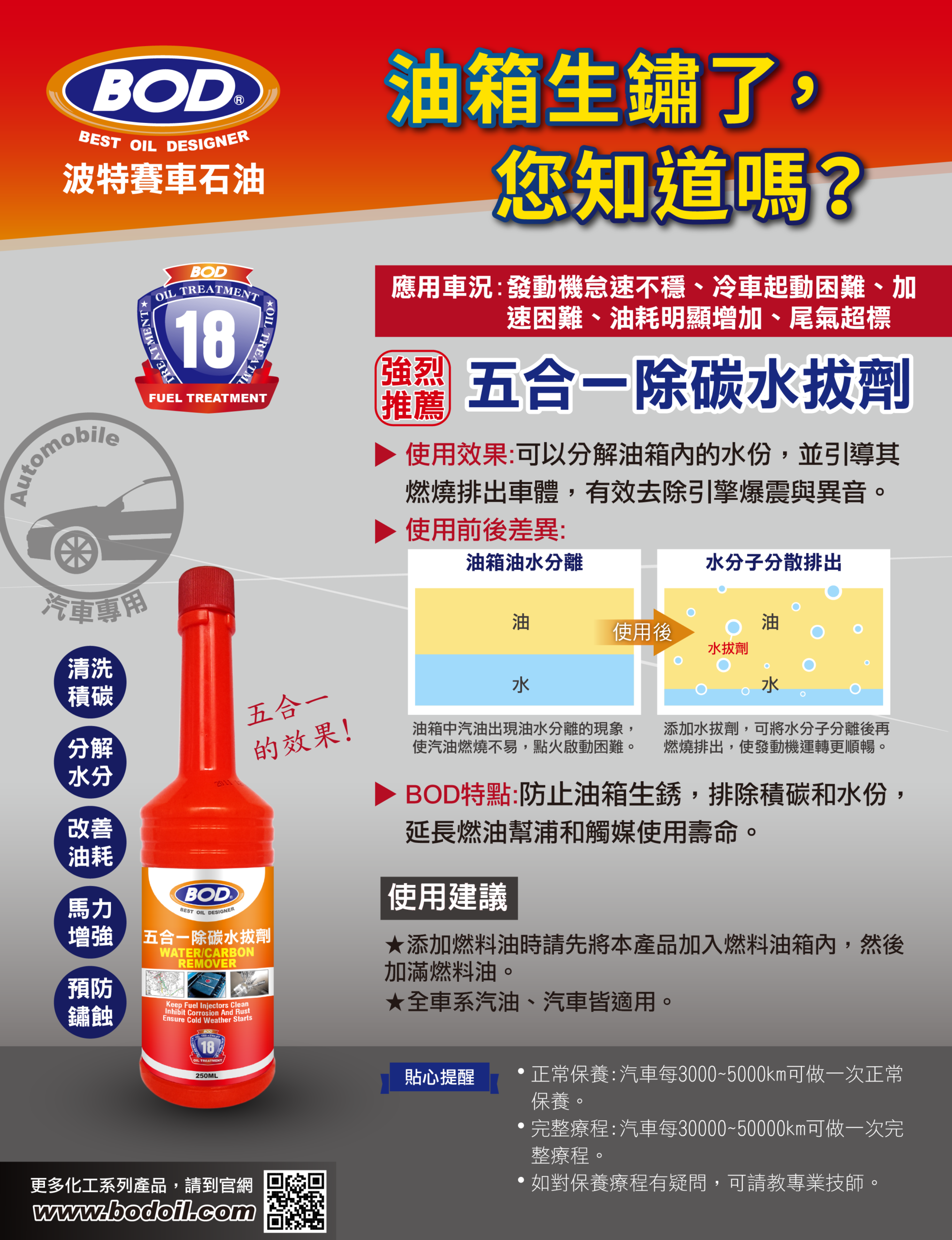 BOD 五合一除碳水拔劑 採用尖端 PEA (聚醚胺) 潔淨因子與特殊水拔成分,能一次掃除從「油箱、油路、噴油嘴、進氣閥到燃燒室」的所有障礙。只需在加油前倒入,即可讓引擎恢復如新車般的輕快感。